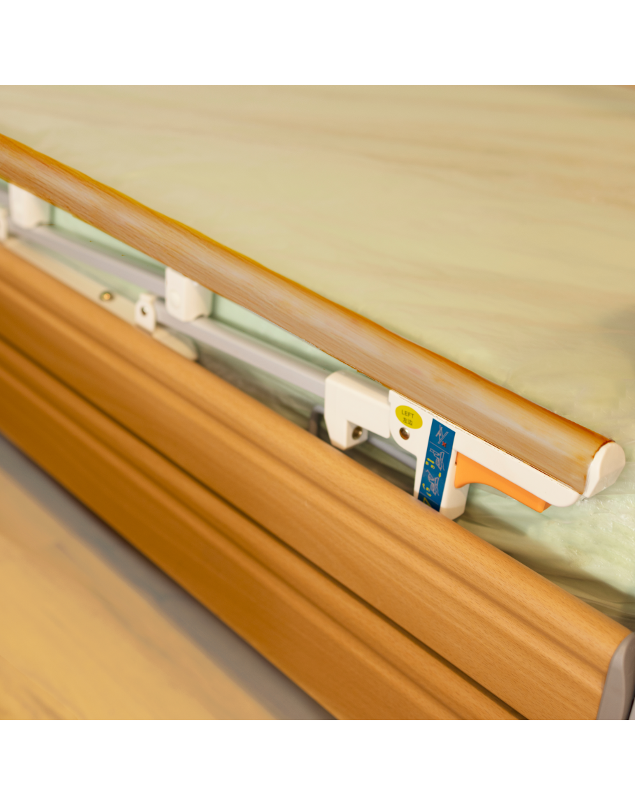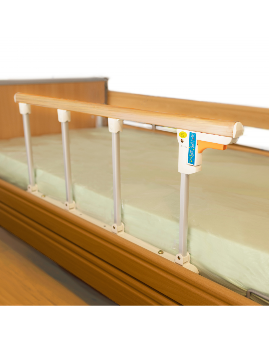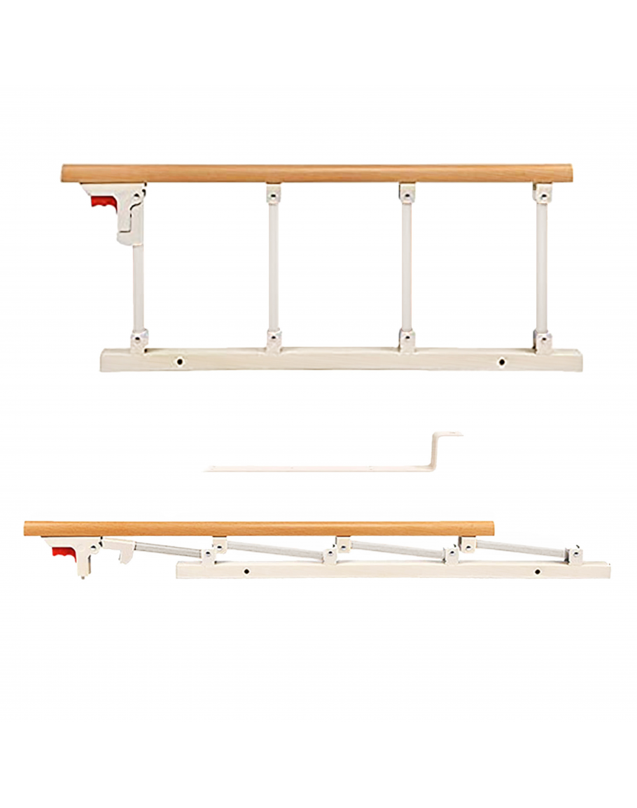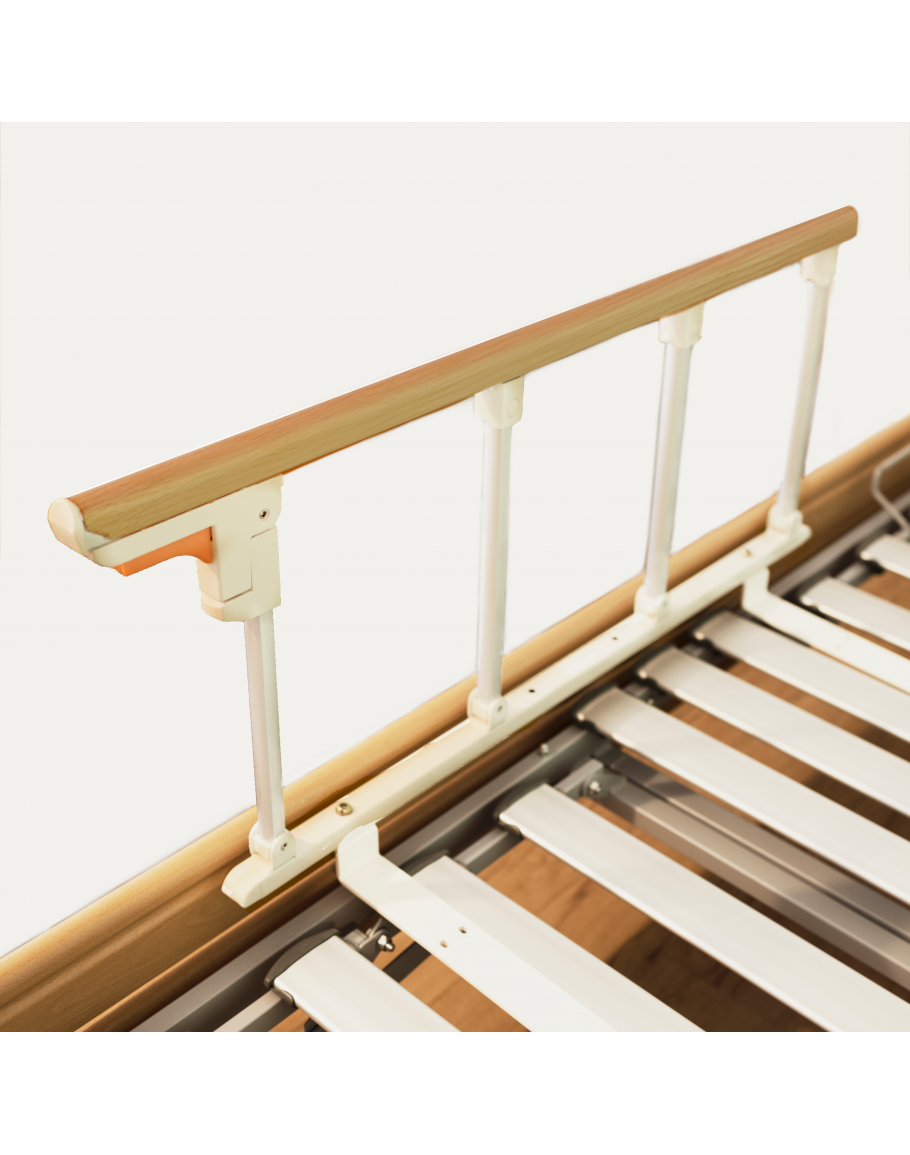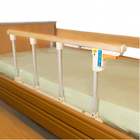 The Bedside Safety Railing (Wooden) is meant to aid patients moving on the bed surface, as well as getting on and off the bed. It can be easily removed for storage when not in use.
