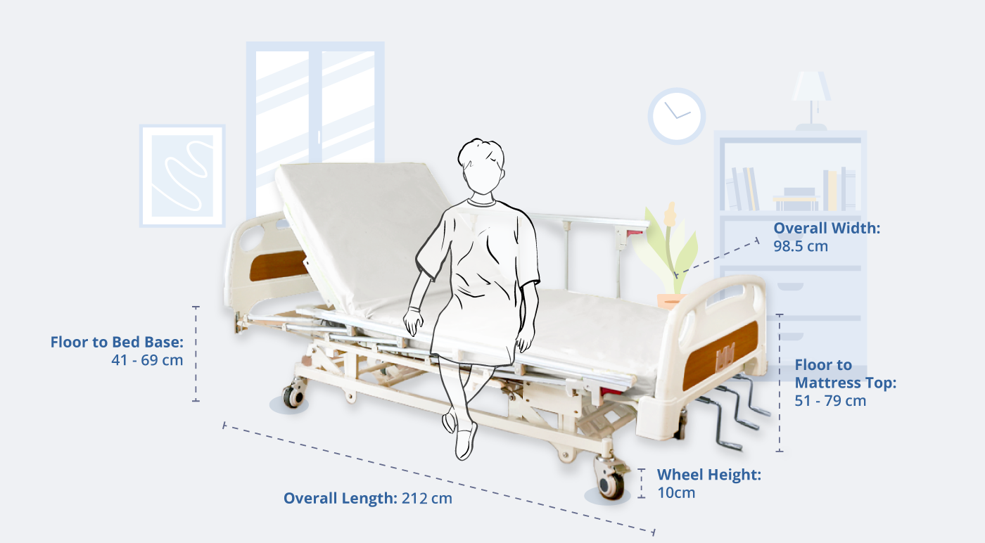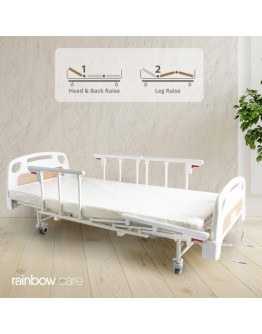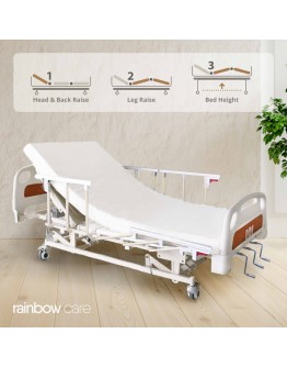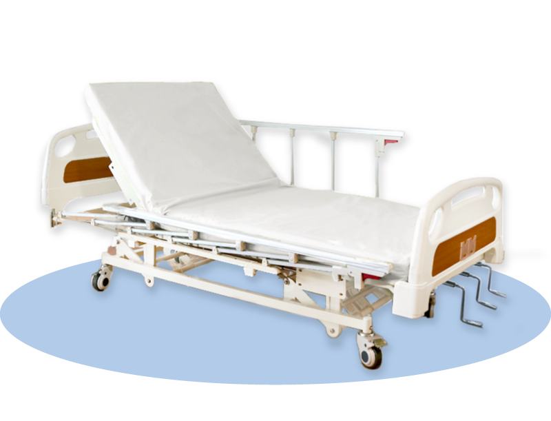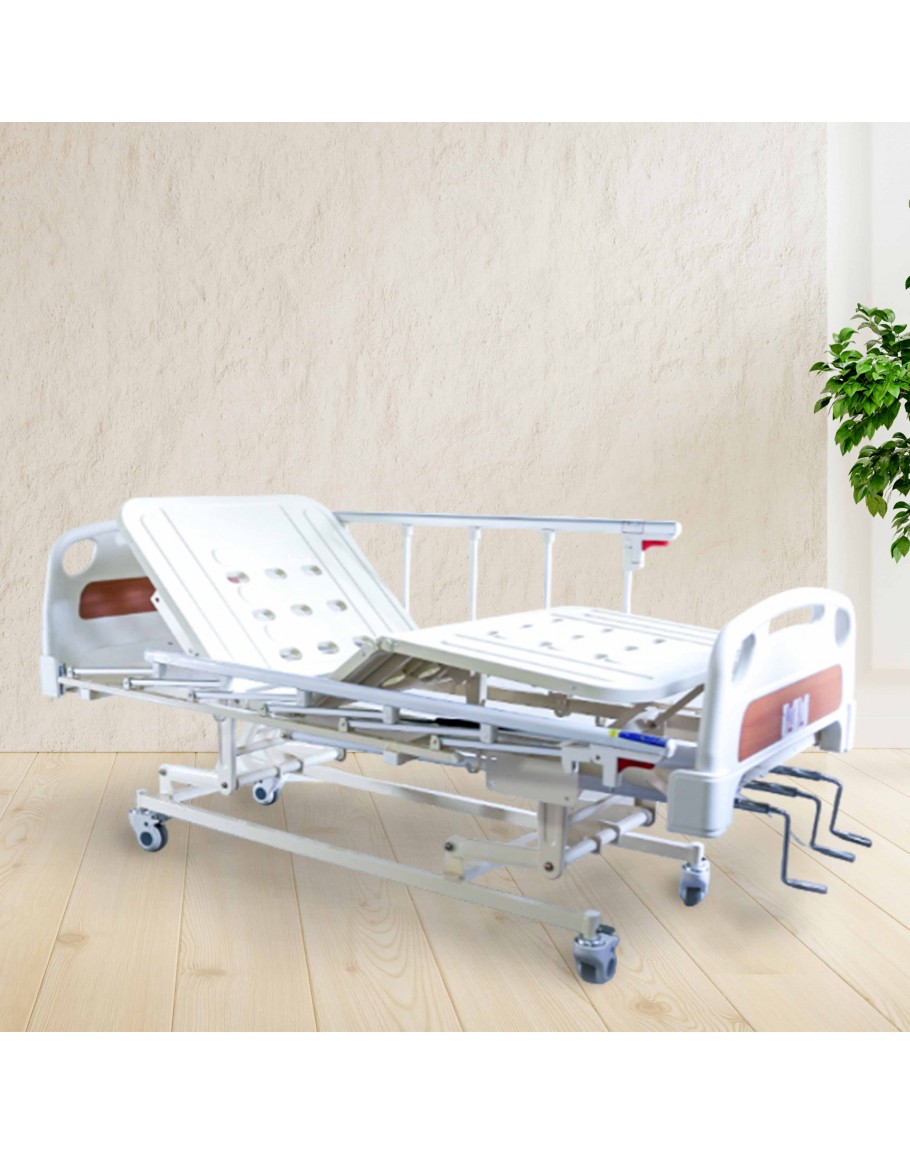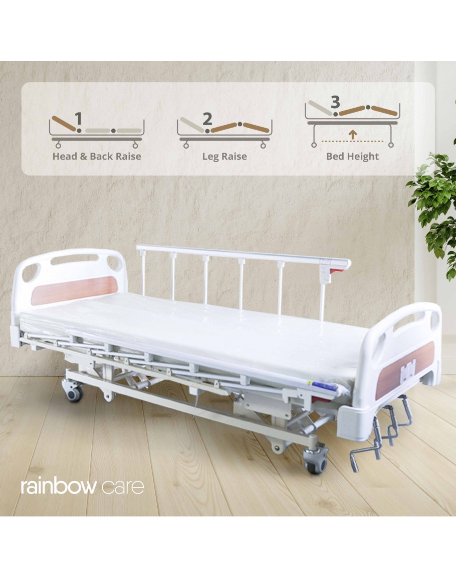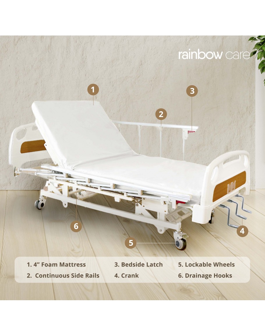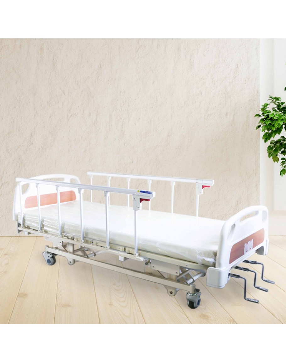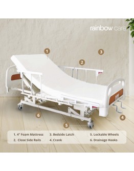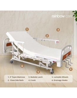 This 3 Crank Manual Hospital Bed has split side panels that allow users to hold on to one of the side rails while getting off for added safety and stability. It is a popular choice as it does not consume electricity.