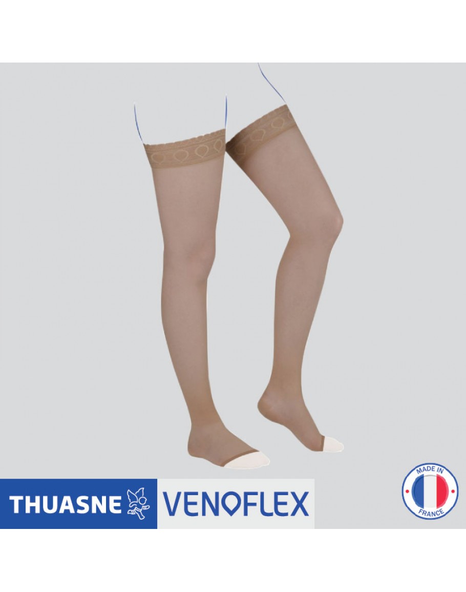 Venoflex® Kokoon Thigh Stockings, made in France, feature soft mesh and opaque microfibre for breathability. They have flat seams, reinforced heel and foot arch, and anatomic calf shape for all-day comfort.