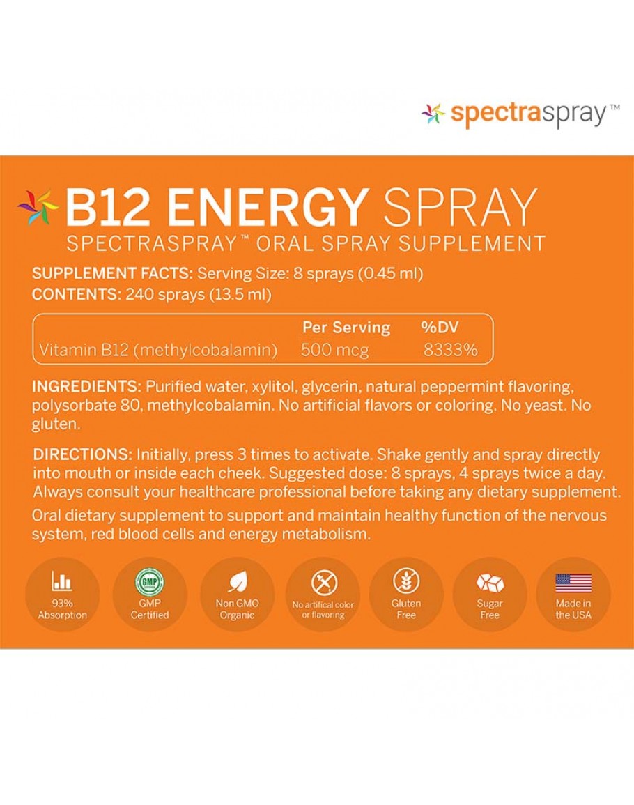 SpectraSpray™ B12 Spray Vitamin Kit is essential for energy, focus, mental health, blood sugar regulation and healthy hair, skin & nails; supports stress reduction and depression symptoms. spray