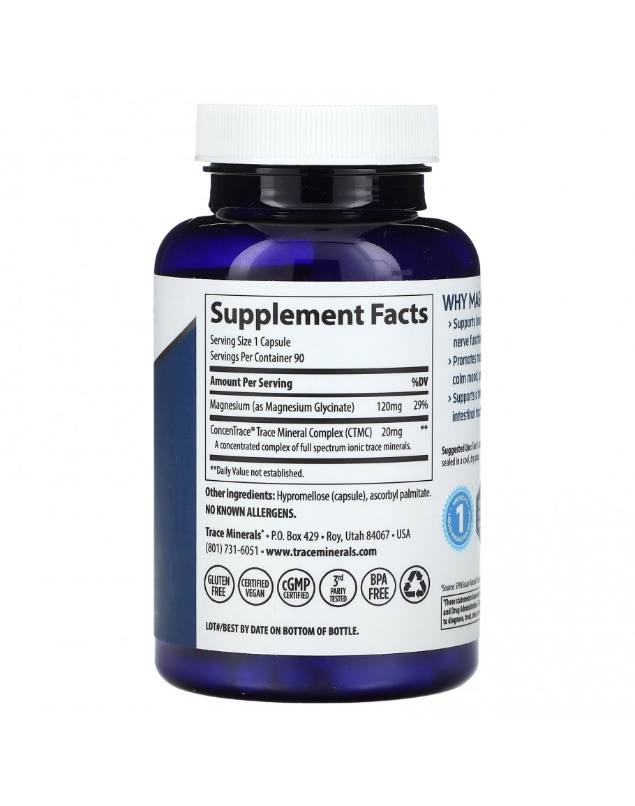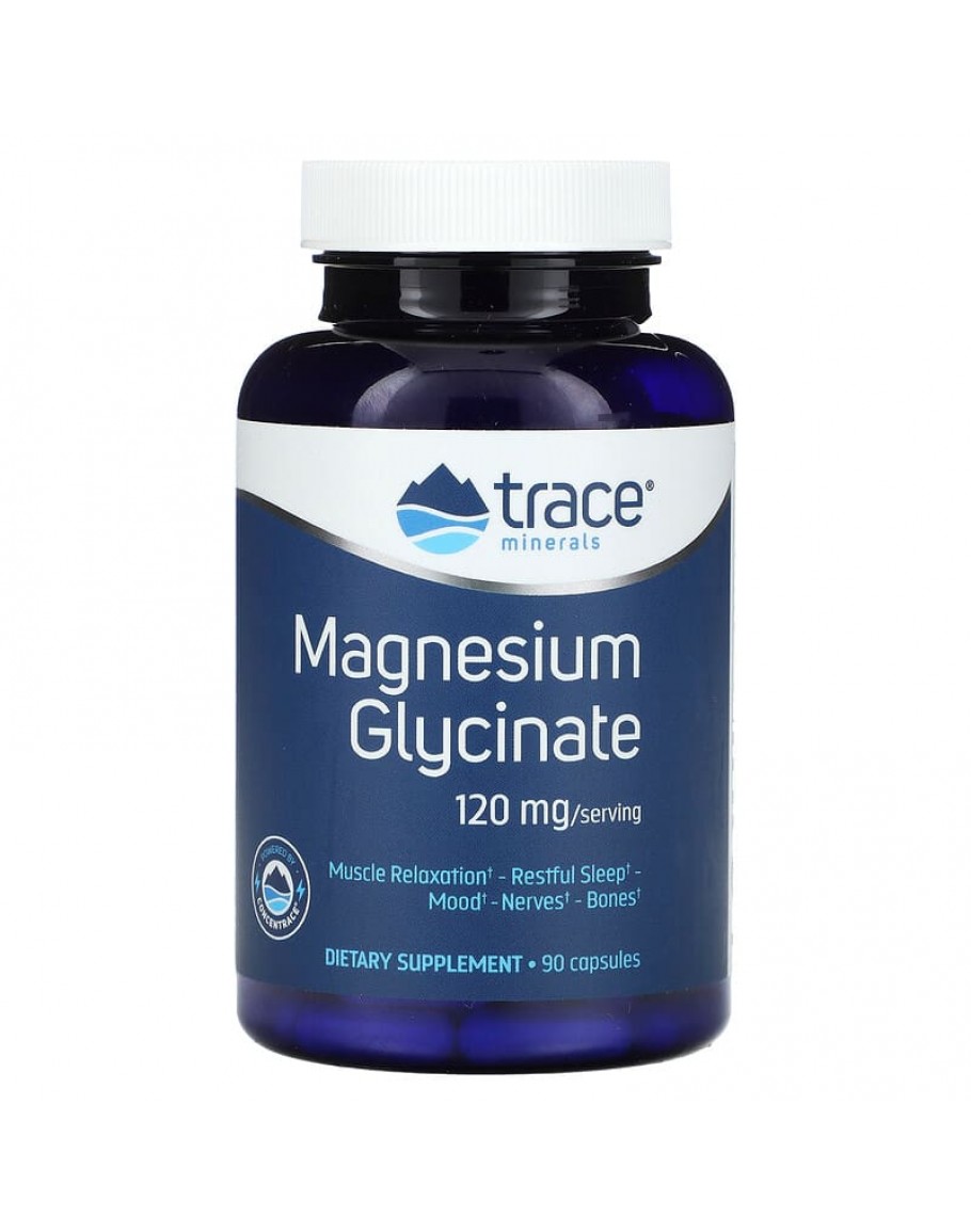 Trace Minerals Magnesium Glycinate is a dietary supplement that comes in a bottle containing 90 vegetarian capsules. It is formulated with magnesium glycinate, a highly bioavailable form of magnesium.