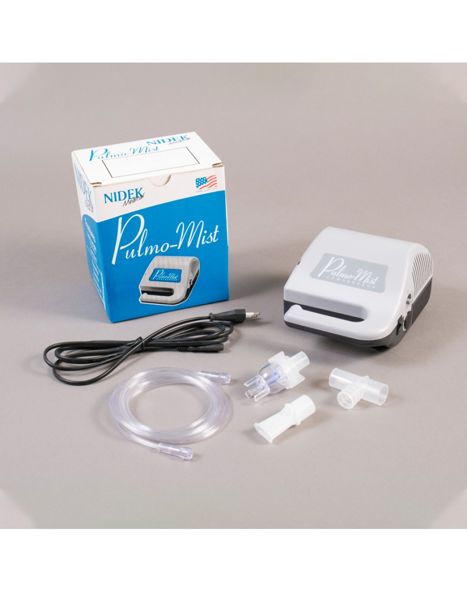 The Nidek Pulmo-Mist Compressor Nebulizer turns liquid medicine into a very fine mist that a person can inhale through a Nebulizer Mask. Person with asthma or another respiratory condition can use to administer medication directly and quickly to the lungs.