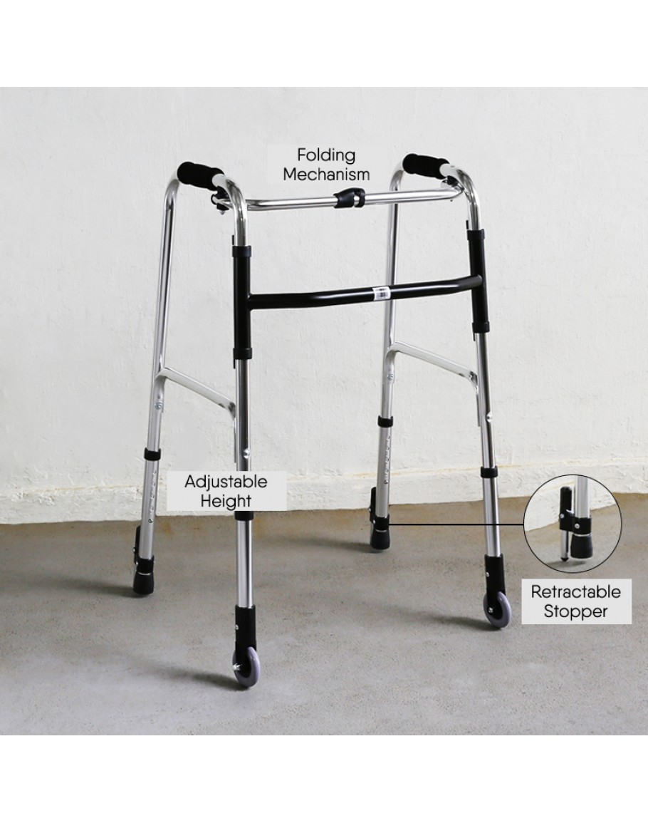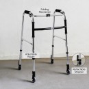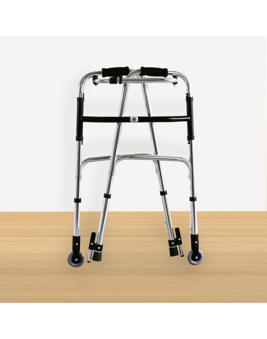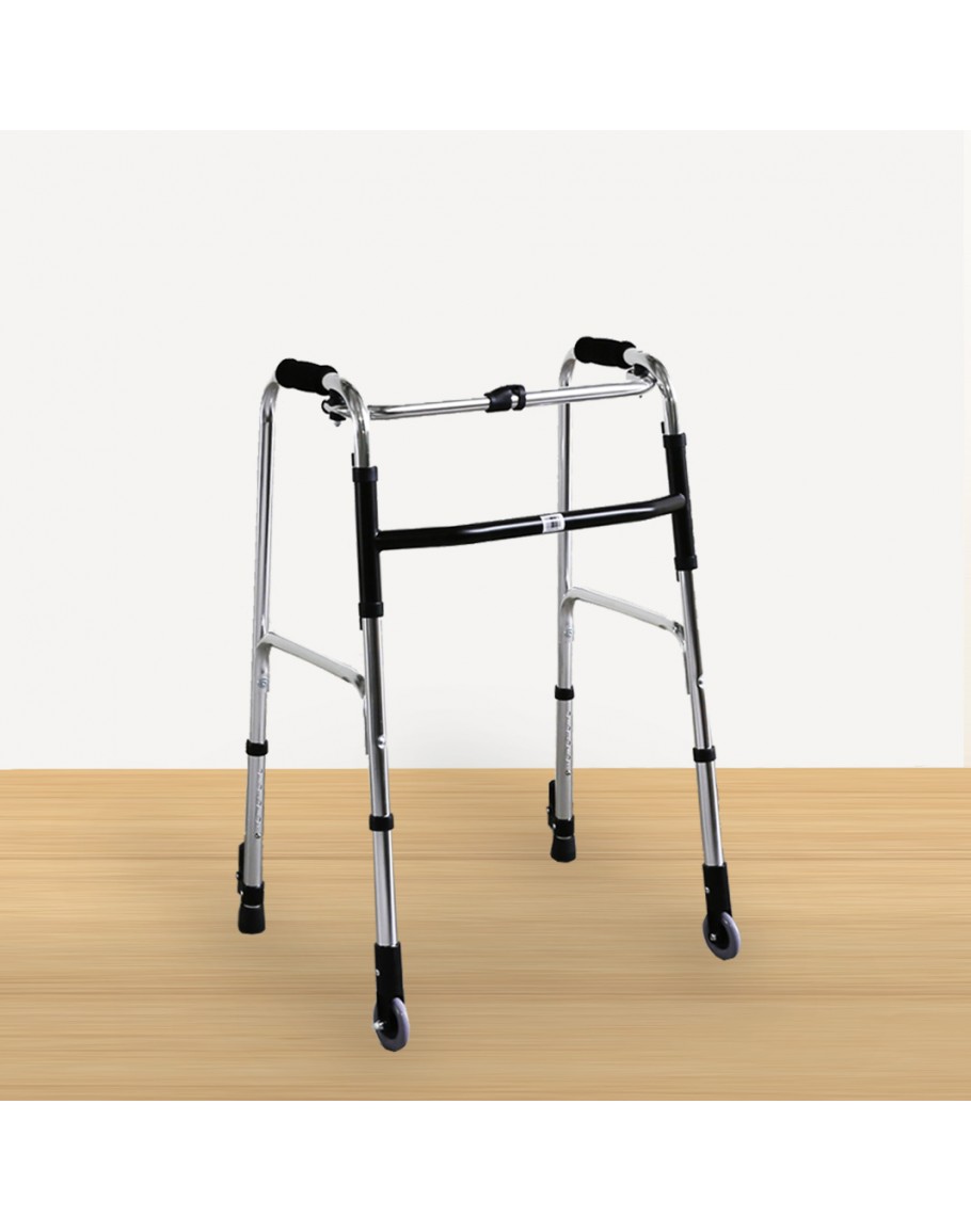 FS9126L Foldable Walking Frame is suitable for both indoor and outdoor use. The walking frame is equipped with two front wheels for enhanced mobility, ferrule tips for secure traction, and a retractable stopper for added safety.