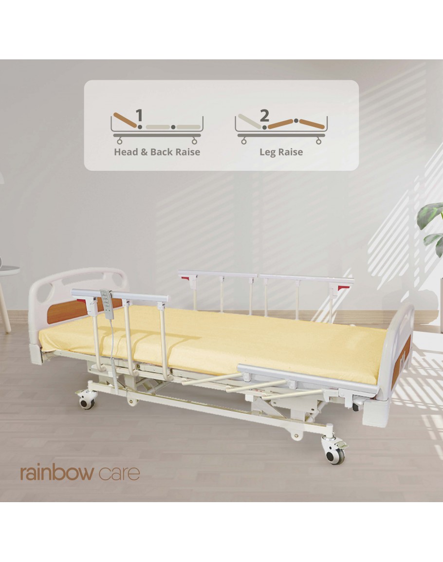 This 2 Crank Electrical Split Hospital Bed has split side panels that allow users to hold on to one of the side rails while getting off for added safety and stability. IV Drip stand included with insertion holes at each corner of the bed.