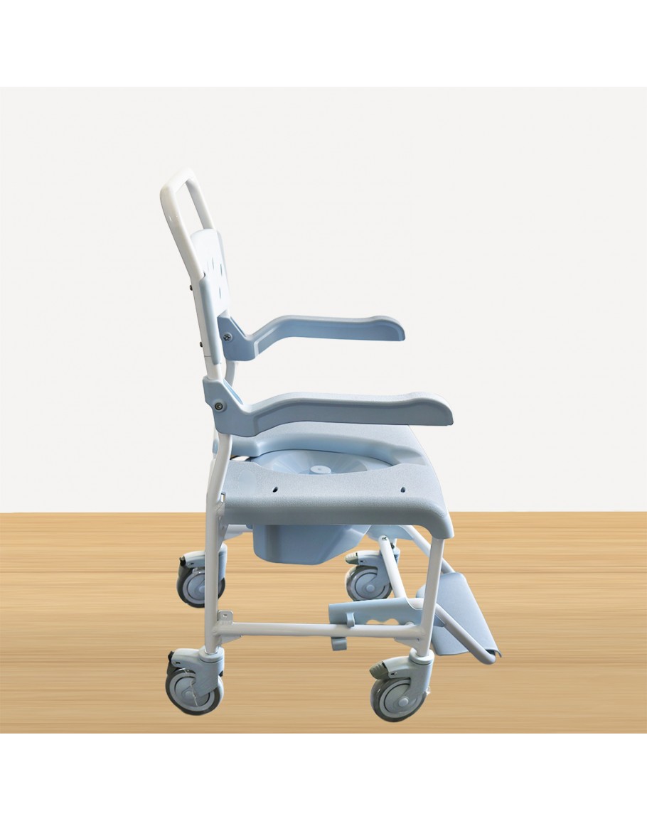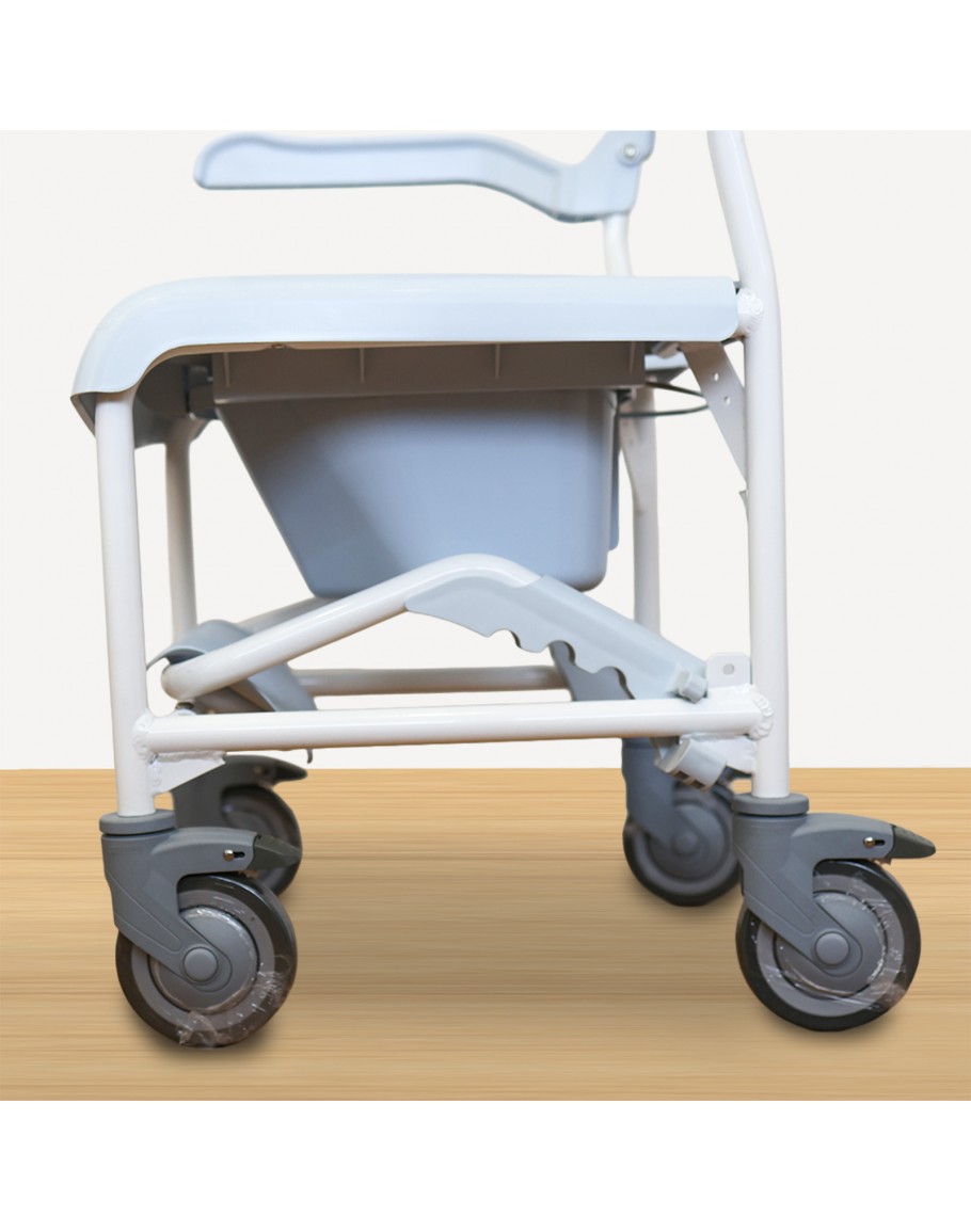 The PLUO Aluminium Commode is designed for patients with restricted mobility. It has wheels to help the patient get to the bathroom or bedroom easily. It may be used as a commode or shower chair.