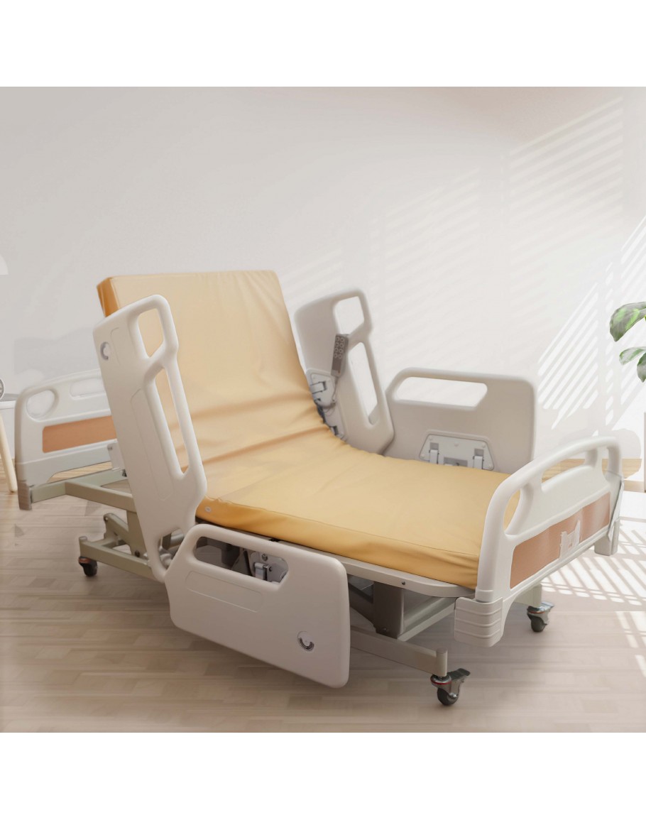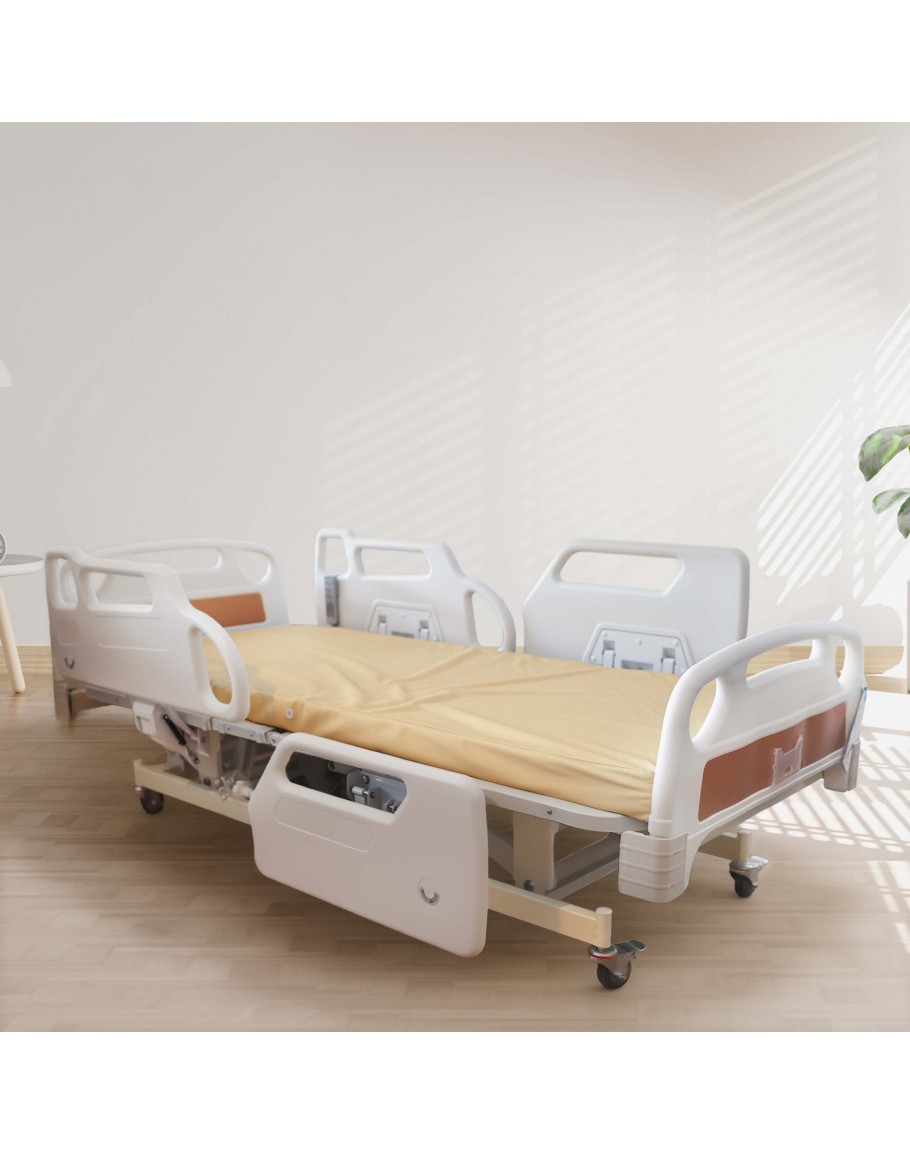 This 3 Crank Electrical Luxury Plus 2 Hospital Bed has split side panels that follow the back raising reclining feature. Increased safety and stability when getting on and off the bed while holding on to the side rails.