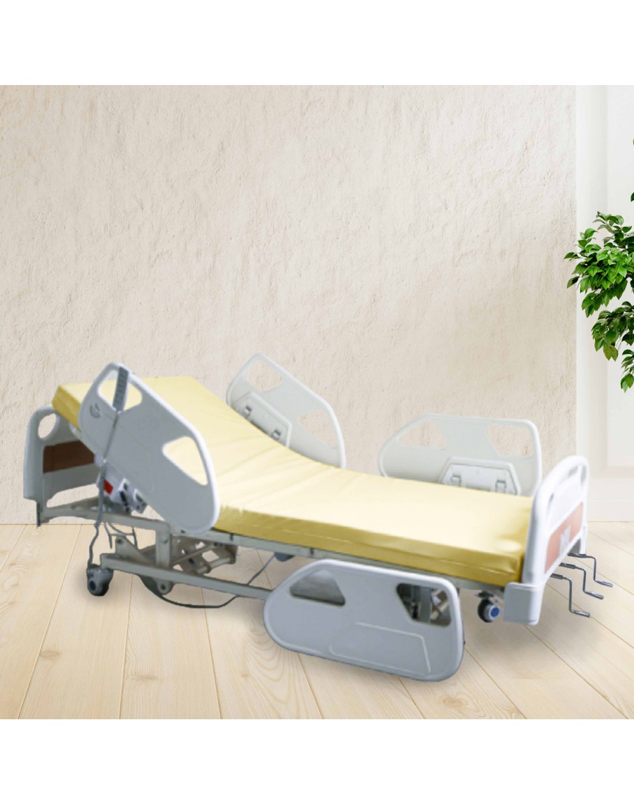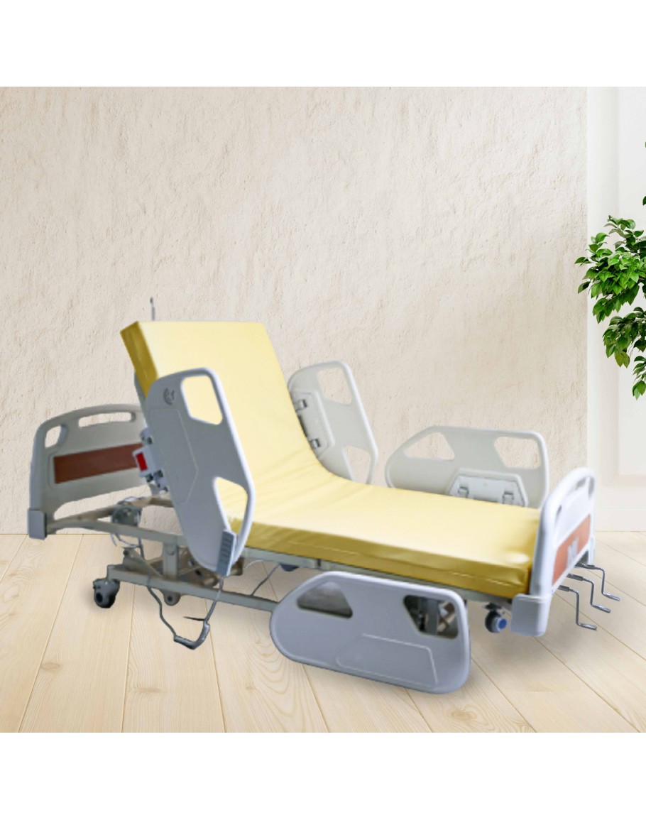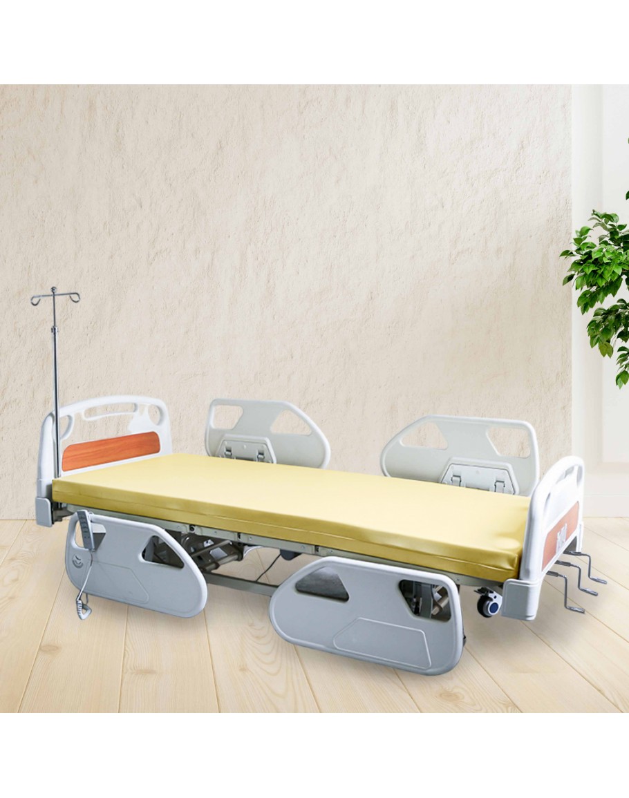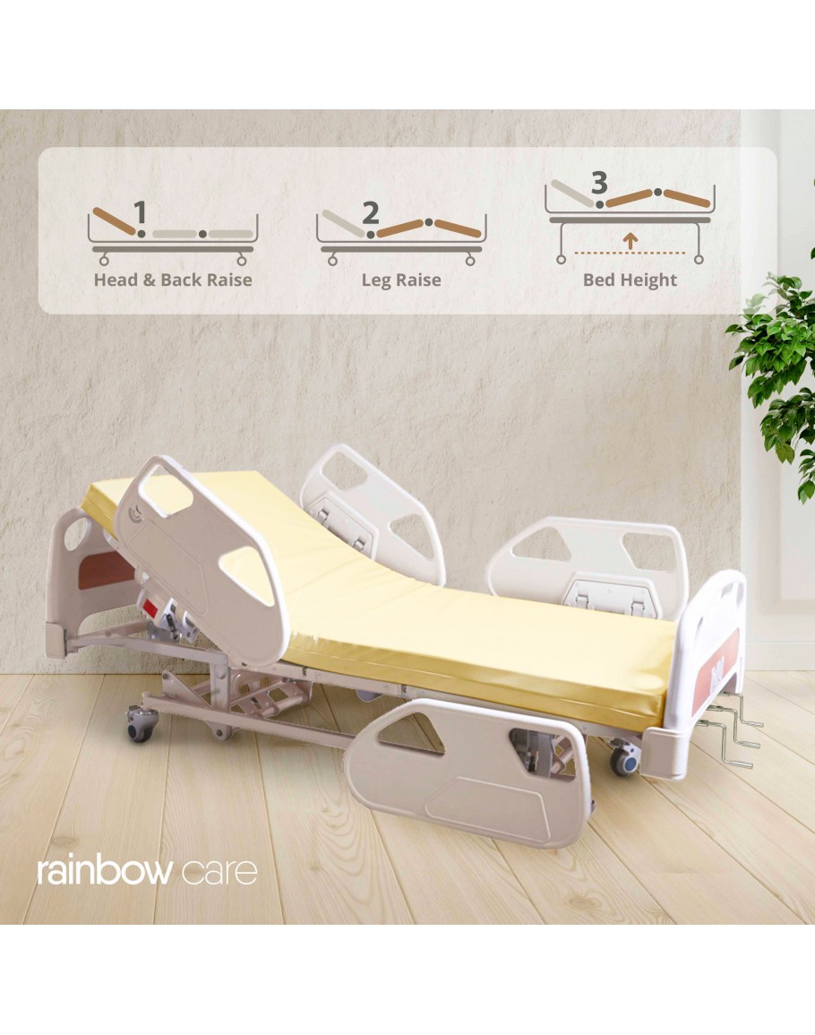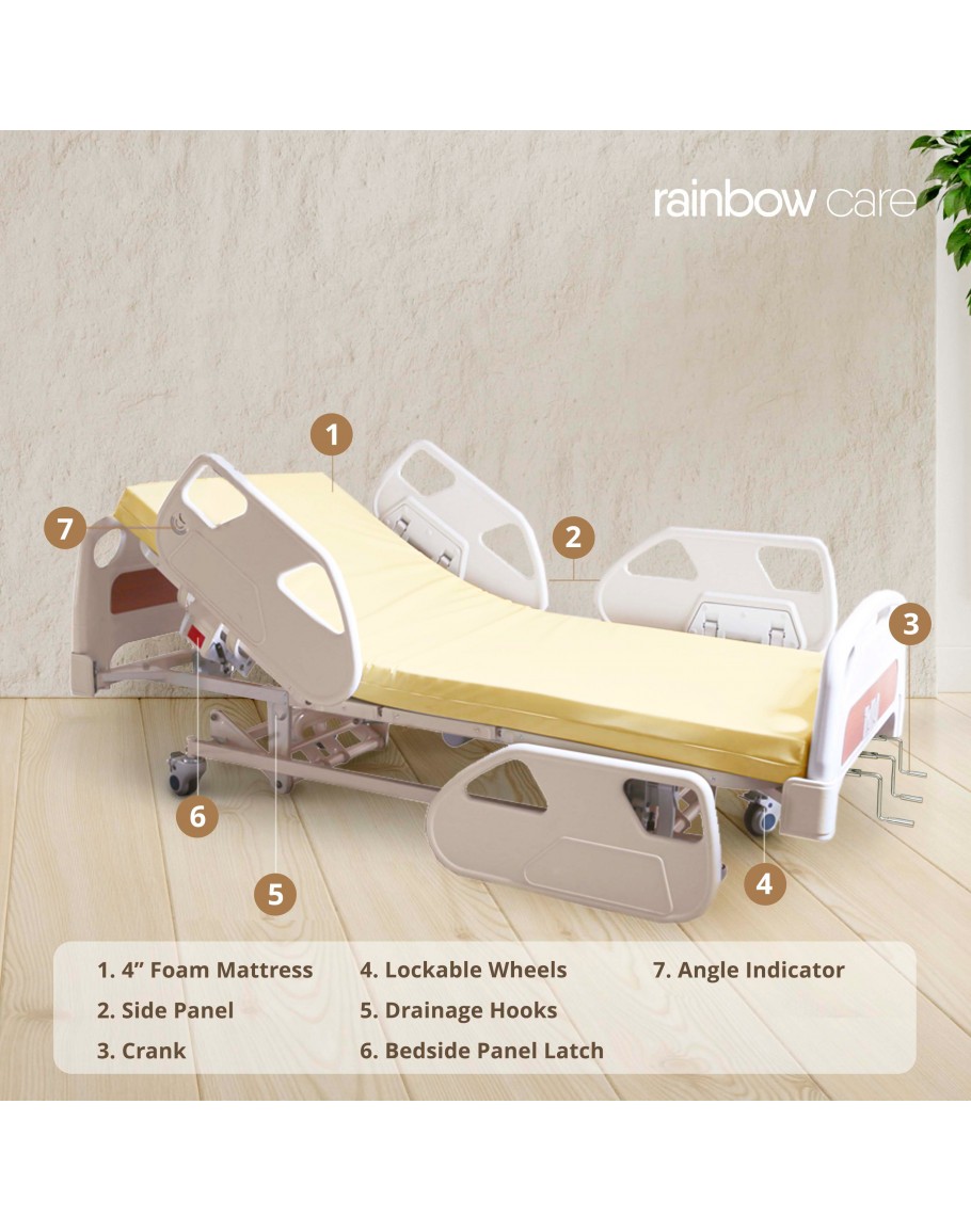 This 3 Crank Manual Luxury Hospital Bed has split side panels that follow the back raising reclining feature. It is a popular choice as it does not consume electricity and yet it can provide all the functions of a hospital bed.