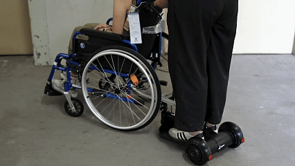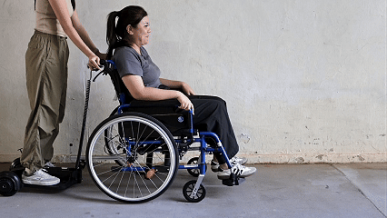 ELATOR Powered Pushing Aid is a German engineered electric wheelchair power assist that reduces caregiver effort on flat slopes and long distances.