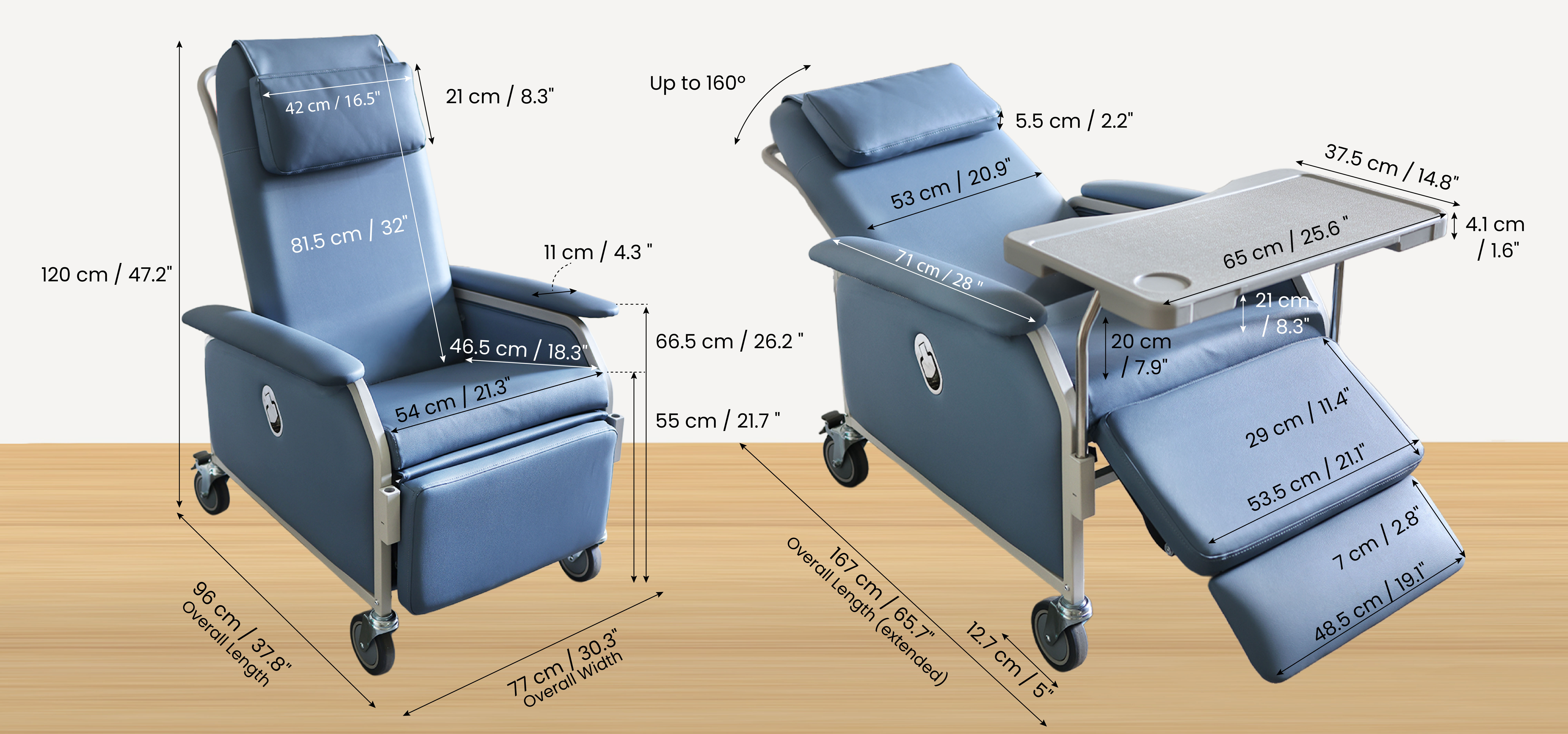 | Reclining Back Rest | | Reclining Leg Rest | | Fixed Arm Rest | | Detachable Table |