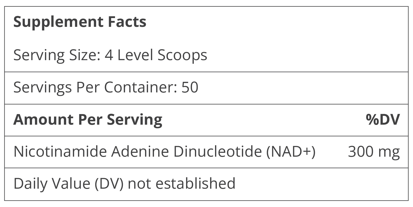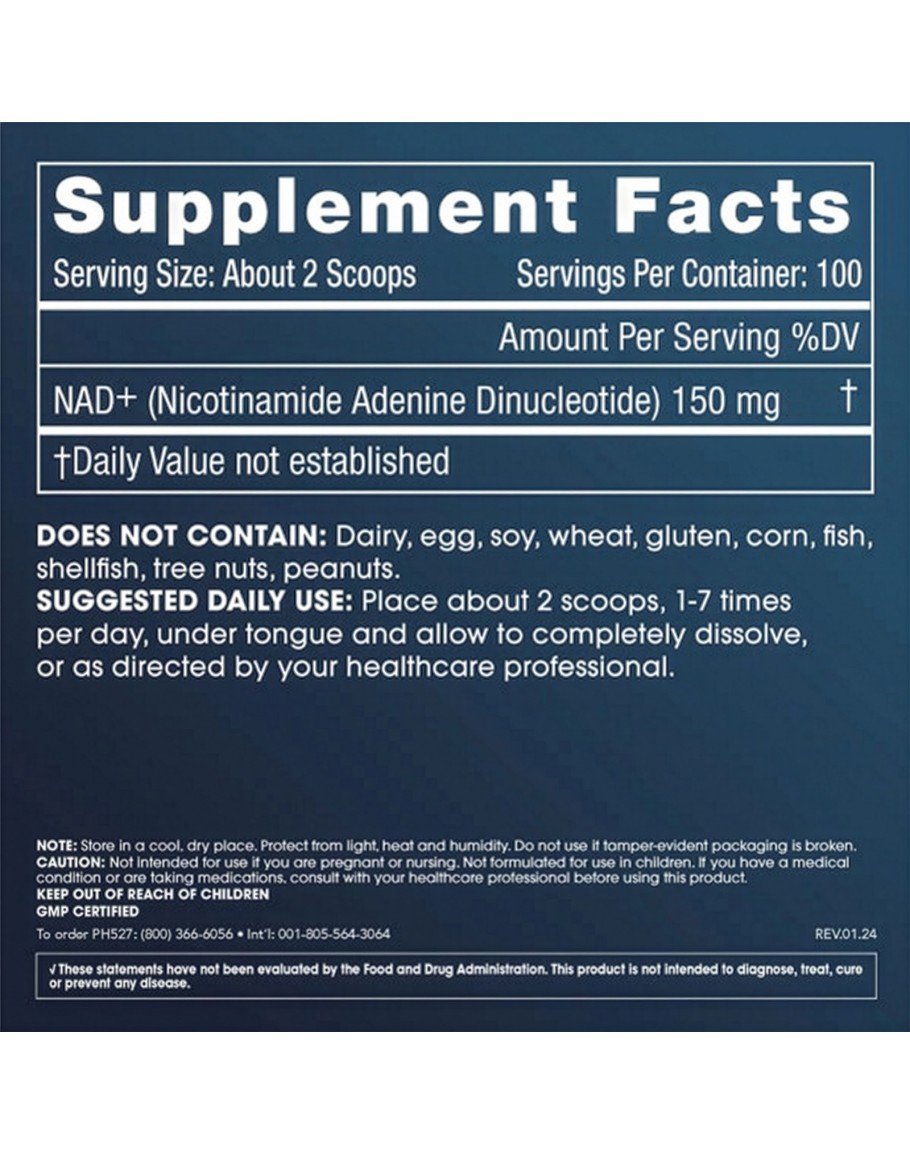 Nicotinamide Adenine Dinucleotide (NAD+): A coenzyme naturally present in all cells, involved in energy metabolism and redox reactions.* Does not Contain Dairy, egg, soy, wheat, gluten, fish, shellfish, tree nuts, peanuts |