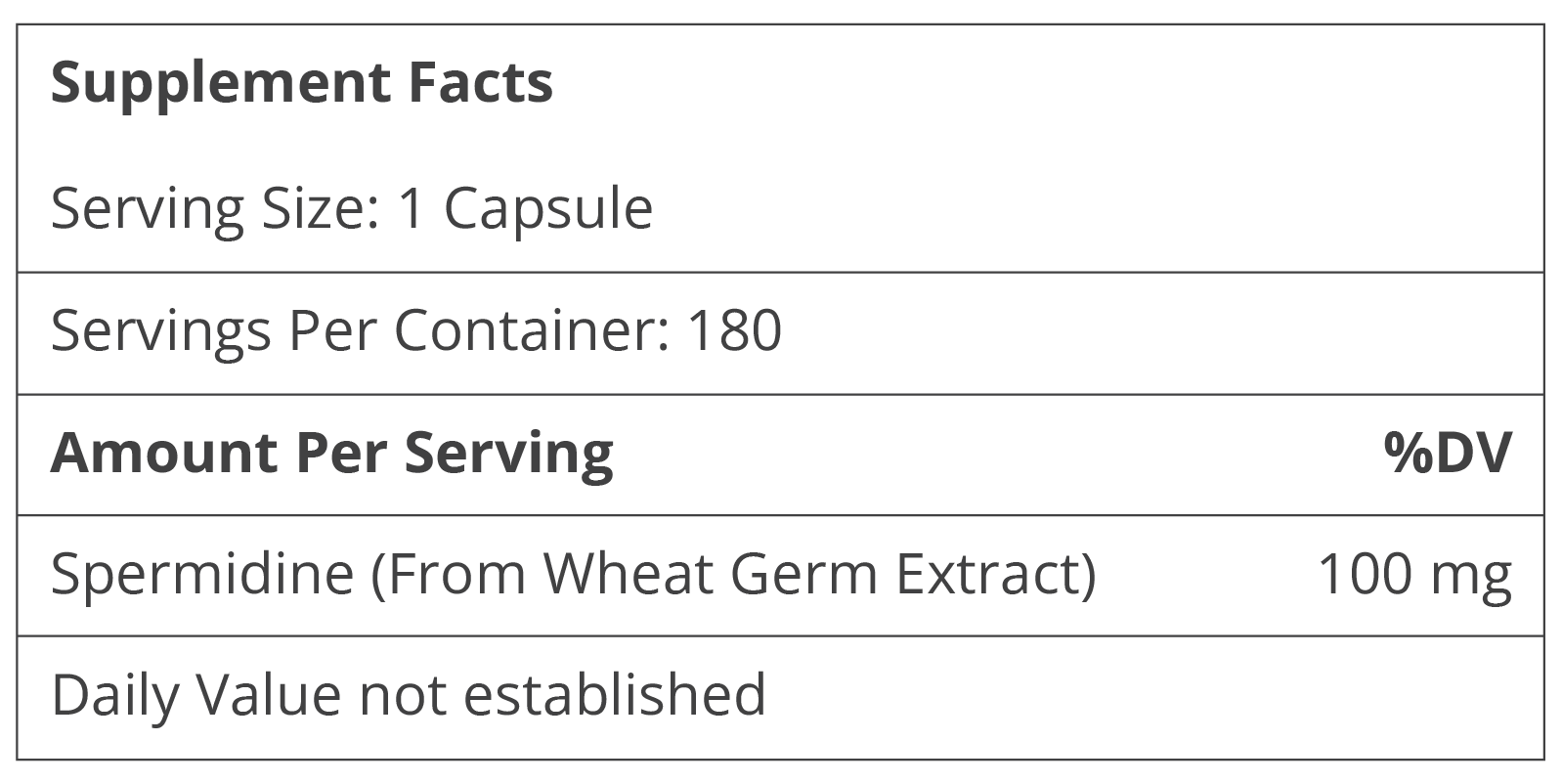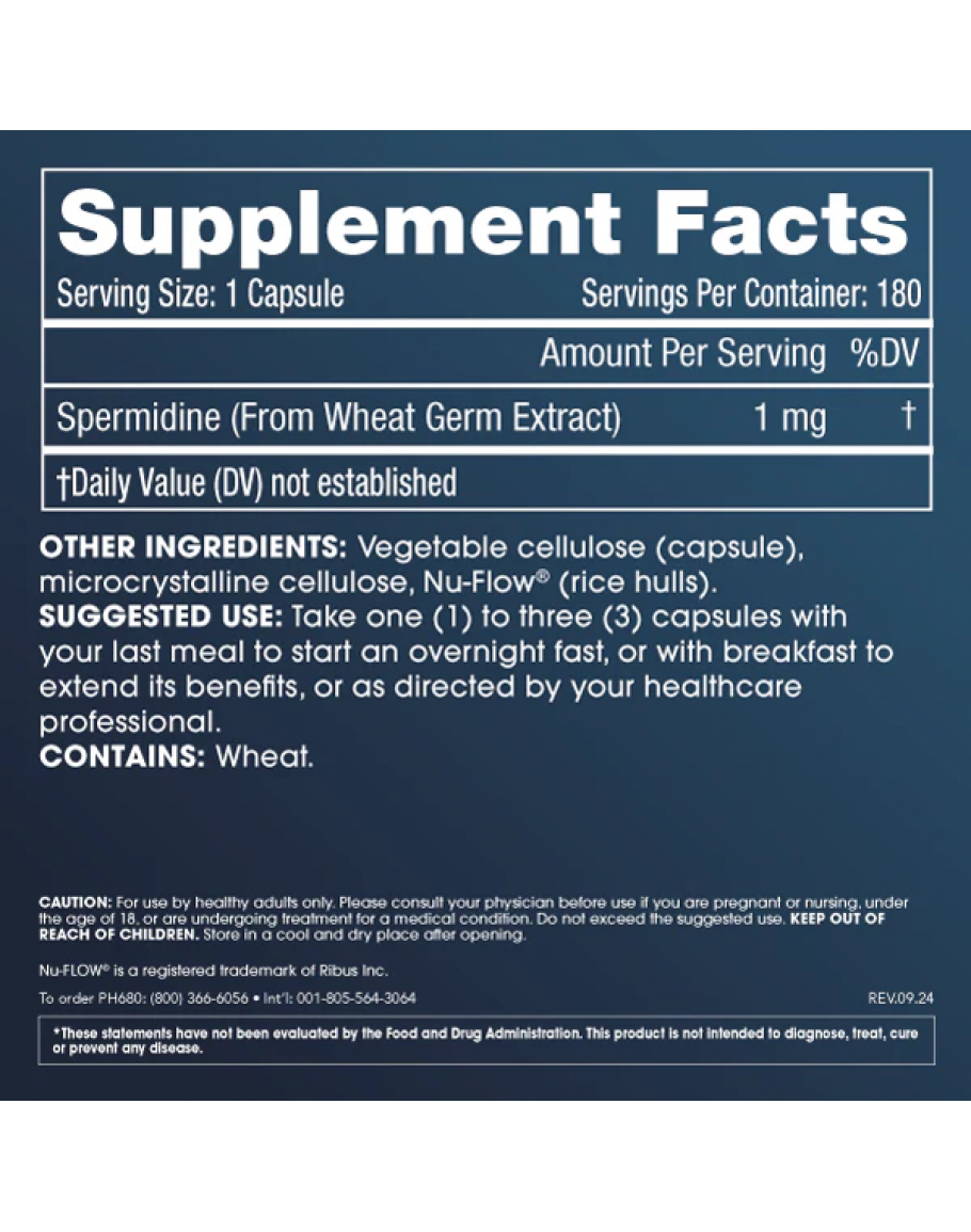 Wheat germ extract: (Triticum aestivum): A concentrated food source of spermidine. *These statements have not been evaluated by the Food and Drug Administration. This product is not intended to diagnose, treat, cure or prevent any disease. Other Ingredients Rice hulls, microcrystalline cellulose, hypromellose (capsule) Made without gluten-containing ingredients |