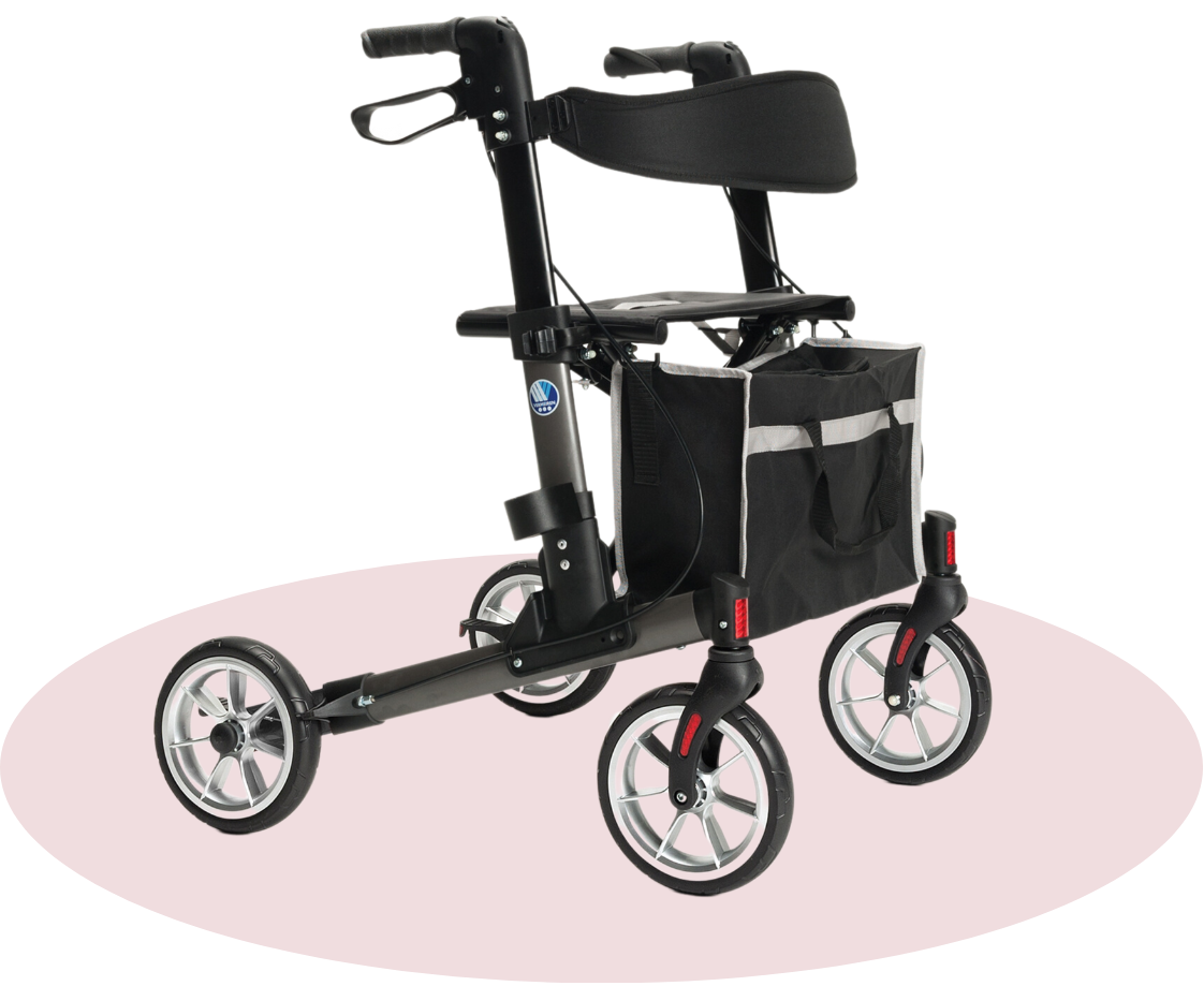 The Quava 4 Wheel Rollator is a walking aid designed to assist users to walk independently and with stability.